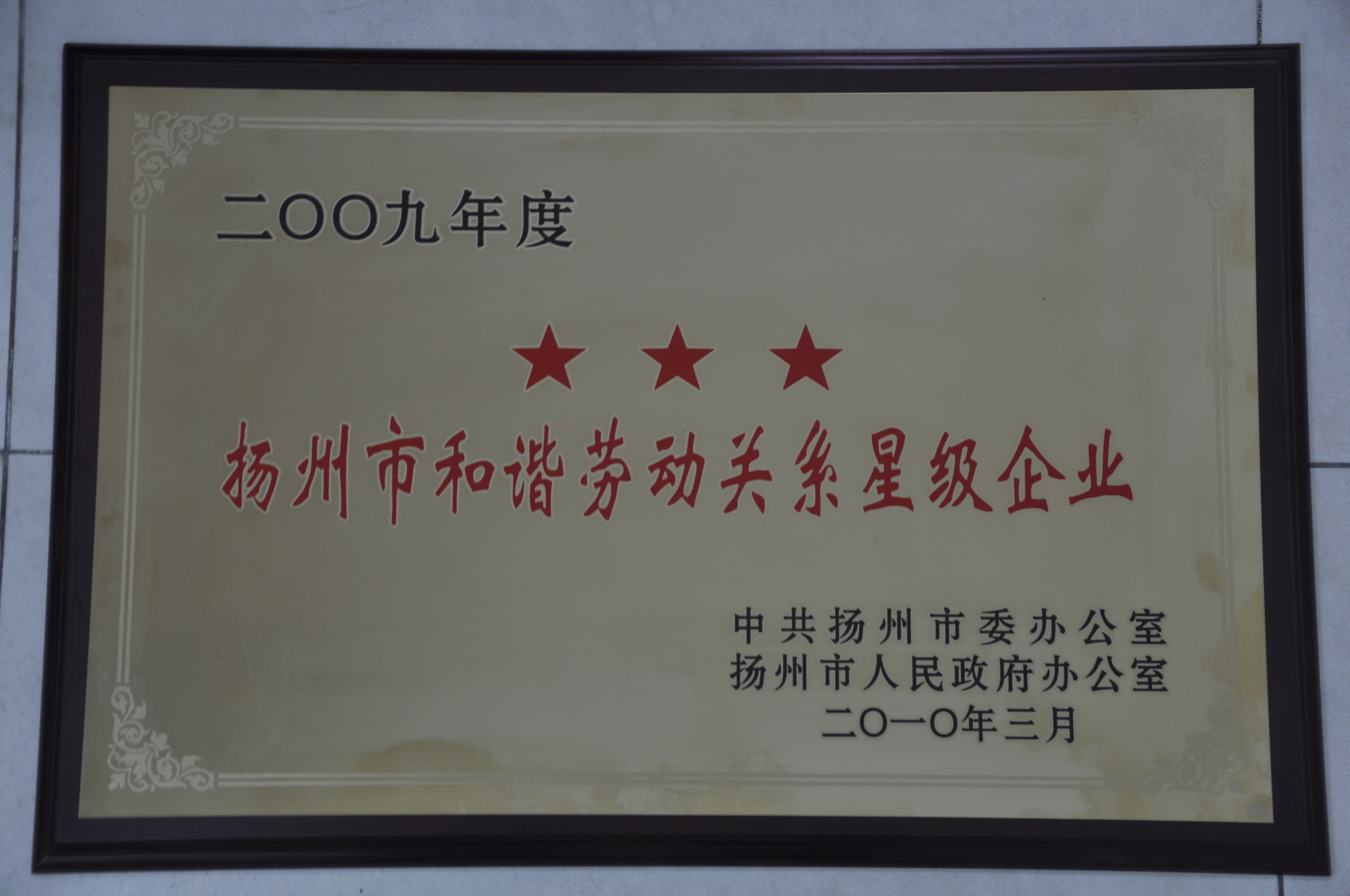 > 集團(tuán)公司獲2009年揚(yáng)州市和諧勞動關(guān)系“三星級企業(yè)”殊榮