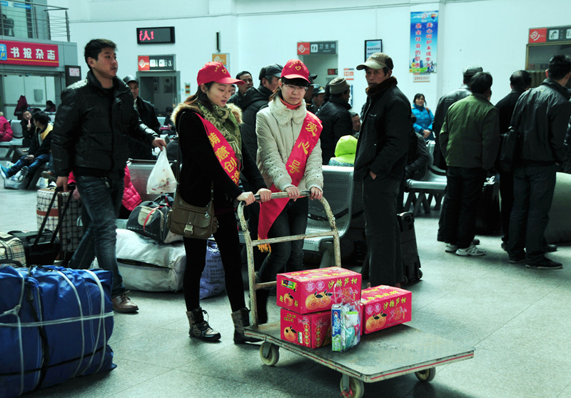 來自揚(yáng)汽集團(tuán)和團(tuán)市委組織的志愿者們有的在進(jìn)站口向旅客指引車站售票、候車等各個(gè)功能區(qū)位置;有的在服務(wù)臺(tái)回答旅客咨詢;有的在安檢處勸導(dǎo)旅客把攜帶的物品放上危險(xiǎn)品檢查儀安檢;有的推著“雷鋒車”幫行李較多的旅客拖運(yùn)箱包;有的給候車的旅客倒上一杯熱水;有的在檢票口幫助維持現(xiàn)場(chǎng)秩序,避免發(fā)生擁堵;還有的在候車大廳勸導(dǎo)旅客請(qǐng)勿吸煙……