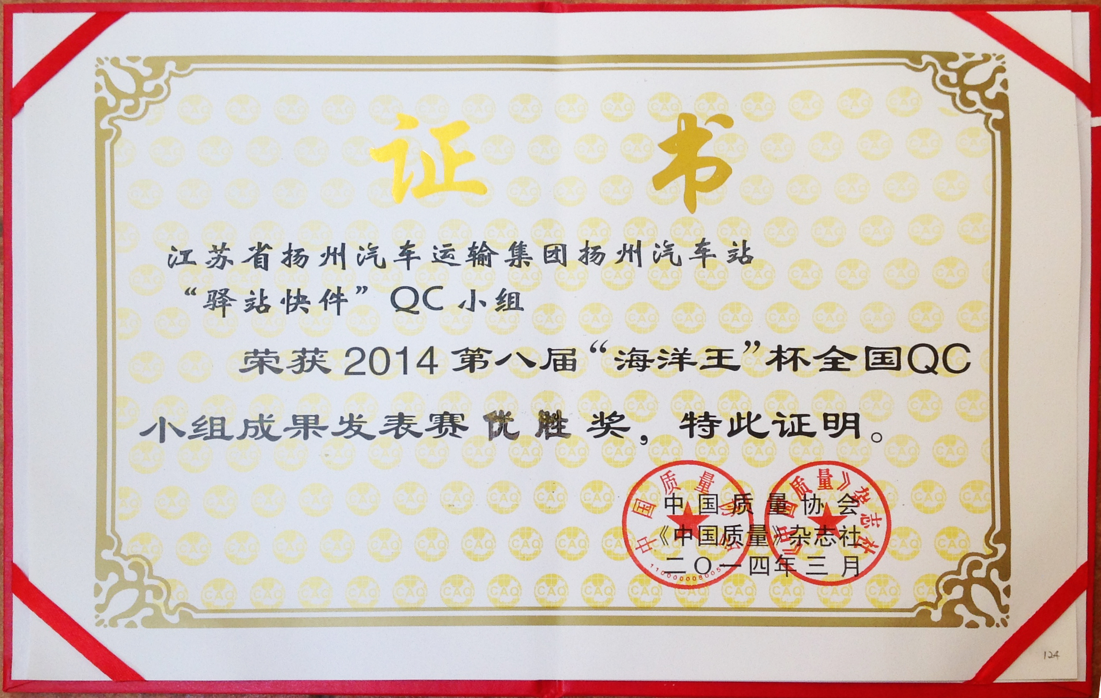 “海洋王”杯QC小組發(fā)表賽是一項全國性比賽,今年共有300多個成果報名,經過層層選拔,來自全國各地QC小組代表500余人,197個成果參加現(xiàn)場發(fā)布。經過5天緊張的成果發(fā)布,我司揚州汽車站“驛站快件”QC小組成員余妍、潘潔發(fā)表的《降低到達庫收發(fā)貨的誤差率》在激烈的角逐中脫穎而出,獲得第八屆“海洋王”杯最高榮譽——優(yōu)勝獎,和其他47個成果一起被直接推薦為2014年度全國優(yōu)秀QC小組。
