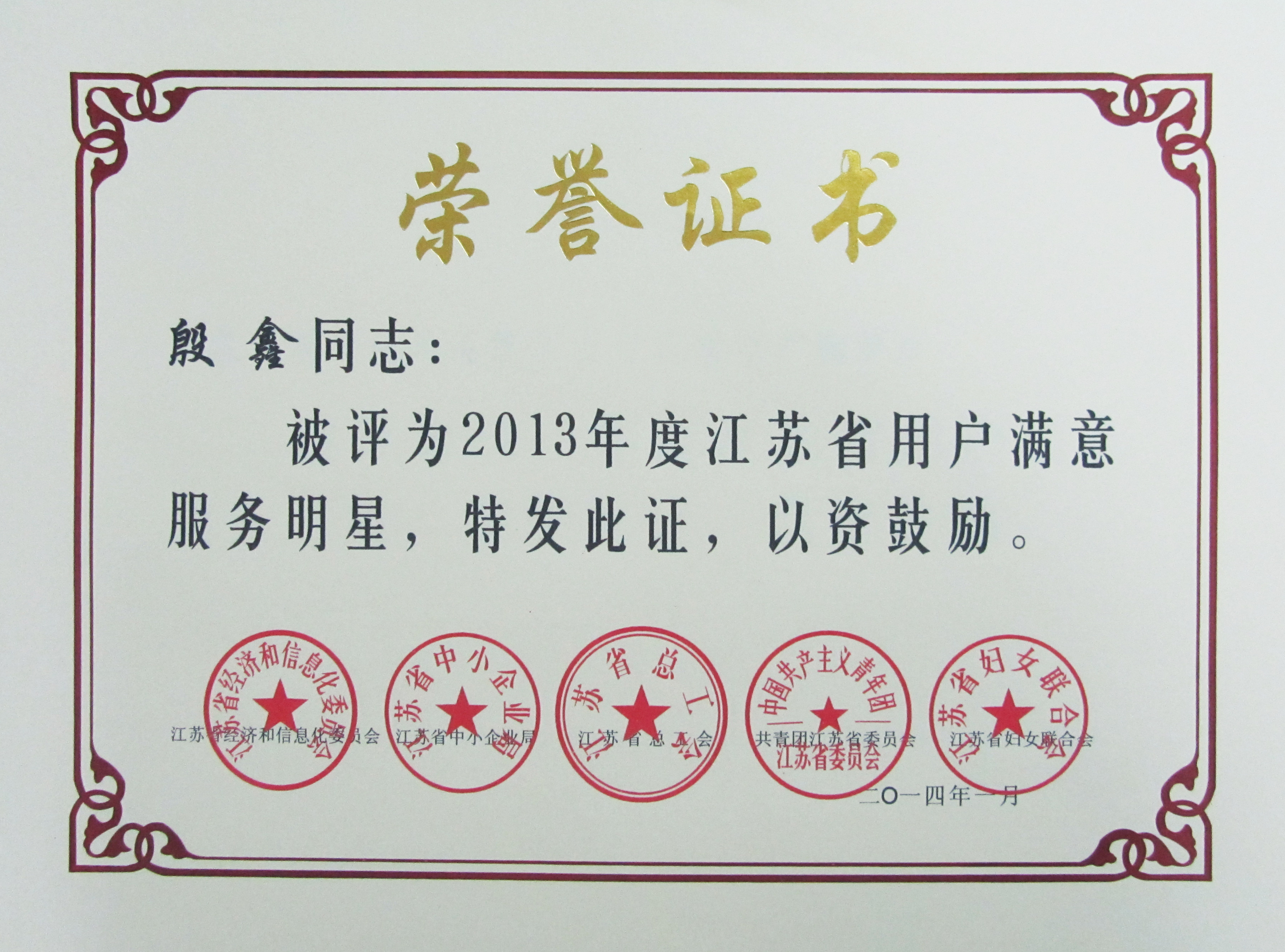 日前,由江蘇省經濟和信息化委員會、江蘇省總工會、江蘇省中小企業(yè)局等五家單位聯(lián)合開展的2013年度創(chuàng)建“用戶滿意服務”活動評審結果揭曉,我司修理廠維護班榮獲2013年度江蘇省“用戶滿意服務”班組,快客分公司殷鑫同志榮獲2013年度江蘇省“用戶滿意服務”明星稱號。
