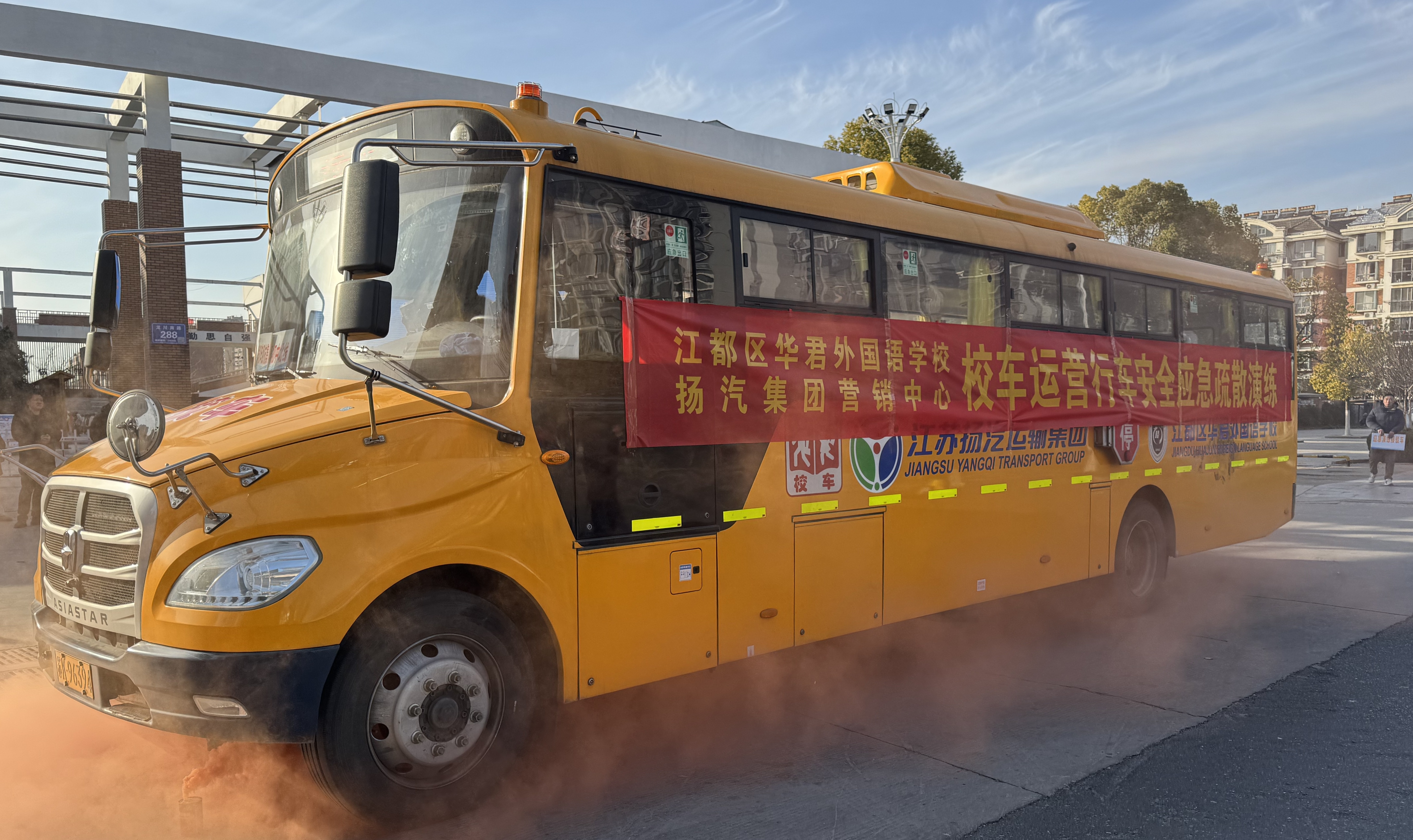 為進(jìn)一步加強(qiáng)校車安全管理,提高師生在校車行駛中的安全應(yīng)急疏散能力,近日,揚(yáng)汽集團(tuán)與江都區(qū)華君外國語學(xué)校聯(lián)合開展了校車運(yùn)營行車安全應(yīng)急疏散演練。揚(yáng)汽集團(tuán)副總經(jīng)理劉旭亮,江都區(qū)華君外國語學(xué)校副校長張?zhí)毂,各單位的安全管理人員及師生共40余人參加本次活動。